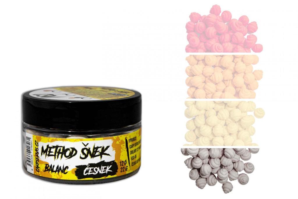 Method šnek balanc - přináší nejen klasické přednosti balanc nástrah, ale má i schopnost velmi intenzivního uvolňvování atraktorů a částečnou rozpustnost. Dalším atributem je inovativní tvar, který imituje přirozenou potravu ? různé druhy plžů, což je činí neodolatelnými pro většinu, i těch nejopatrnějších kaprovitých ryb. Nástrahu je možné dipovat pomocí Aroma Pop up nebo Aroma speciál od CSV. Aromatizační prostředky jsou nositelemidentických pachových silic, které jsou použity přímo v Method šnek balančních nástrahách. - Příchuť: ČESNEK