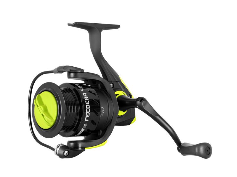 Naviják je vybaven sedmi (6+1) kuličkovými ložisky a převodovým poměrem 5,2:1, který zajišťuje dostatečně rychlé vytažení sestavy na břeh bez větší námahy. Naviják FEEDERA má také pevnou hřídel z nerezové oceli a silný kovový překlapěč s rolničkou, který zvyšuje odolnost a pevnost tohoto modelu. Sklopná klička navijáku má matně černou povrchovou úpravu a černou gumovou rukojeť, která je příjemná do ruky.