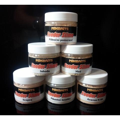 Feeder slime je sypký obalovací dip, který na jakékoli nástraze vytvoří měkký chumáčkový povrch, pro ryby neodolatelný. Dip i slime jsou použitelné samostatně nebo spolu dohromady a lze s nimi zatraktivnit nejen peletky, extrudy či rohlíkové boilie, ale též bílé červy, kukuřici, konopí a jiné nástrahy.
