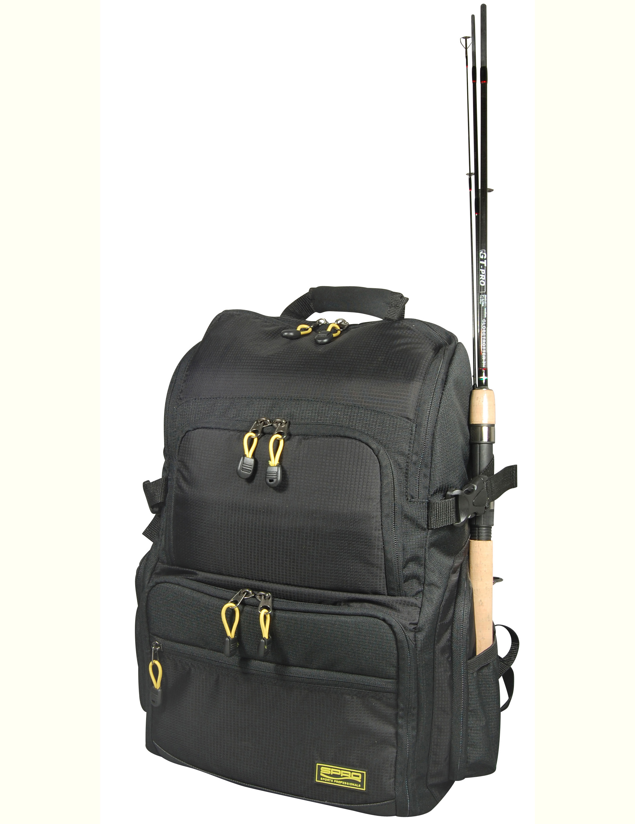 Velký batoh s vnějšími kapsami a možností připojení prutu. Včetně 4 krabiček (27,5x18x14 cm). 600D nylon s 300D PU potahem. Rozměry: 27x21x41cm.