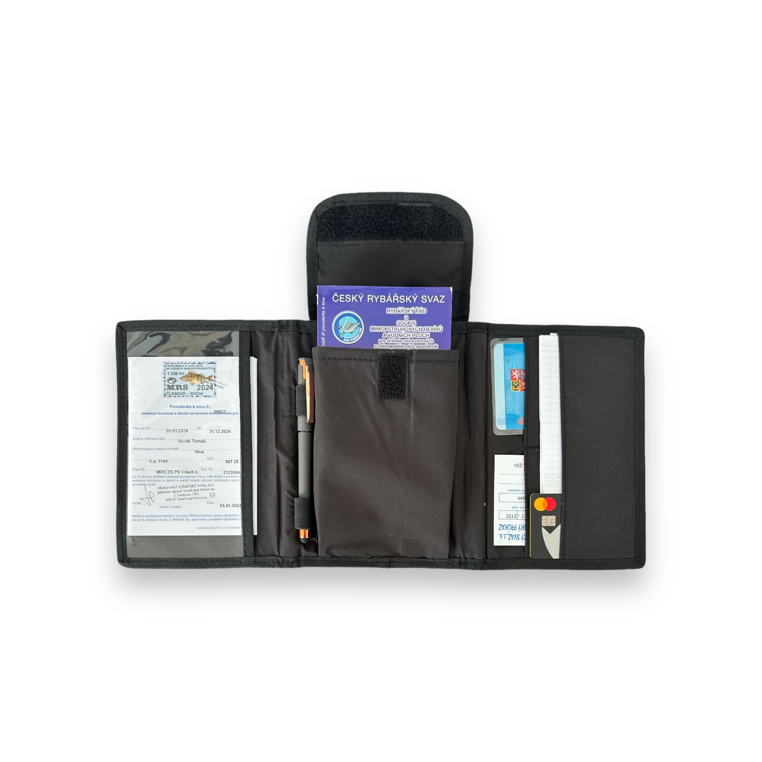 Pouzdro je rozděleno do tří segmentů, uprostřed pouzdra se nachází velká kapsička se zajištěním proti vypadnutí pro rybářský řád a soupis pro držitele celosvazových a celorepublikových povolenek, ale je možné ji využít i pro vložení smartphonu o uhlopříčce 6,7" a více, dále se zde nacházejí gumová poutka na vložení pera. Na levé straně se nachází jedna velká slídová kapsa pro vložení například dokladů nebo rybářského řádu. Na pravé straně je prostor pro vložení například členského průkazu, rybářského lístku, příručního kalendáře, sumáře, kreditní karty a jiných drobných věcí.